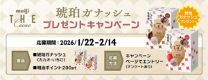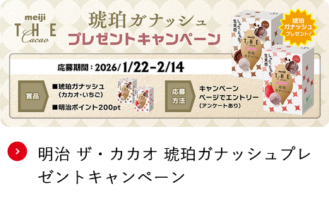 明治会員ID登録&エントリーで、明治 ザ・カカオ 琥珀ガナッシュプレゼントまたは明治ポイント200ptが合計1050名に当たります。
