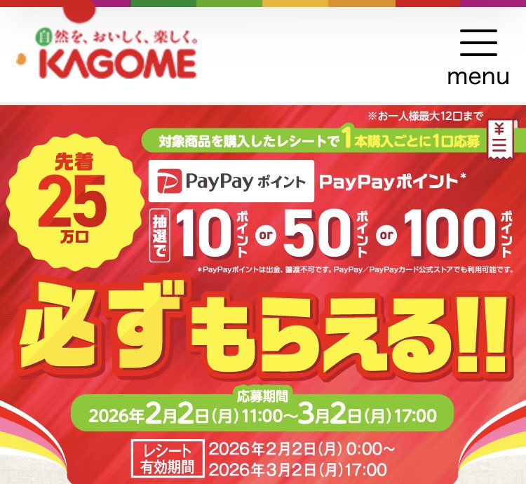 レシート有効期間: 2026年2月2日(月)0:00 ~ 2026年3月2日(月)17:00