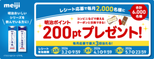 明治会員「明治おいしい牛乳シリーズ」購入レシートで抽選で200ポイントが合計6,000名様(各月2,000名様)に当たります!