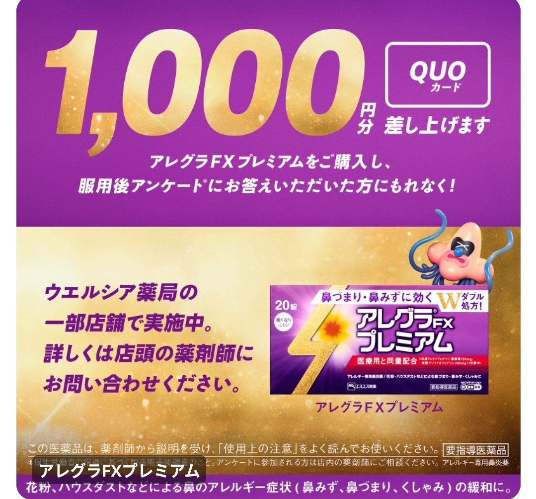「アレグラFXプレミアム」を購入し、服用後アンケート参加でもれなくQUOカード1000円分がもらえます。