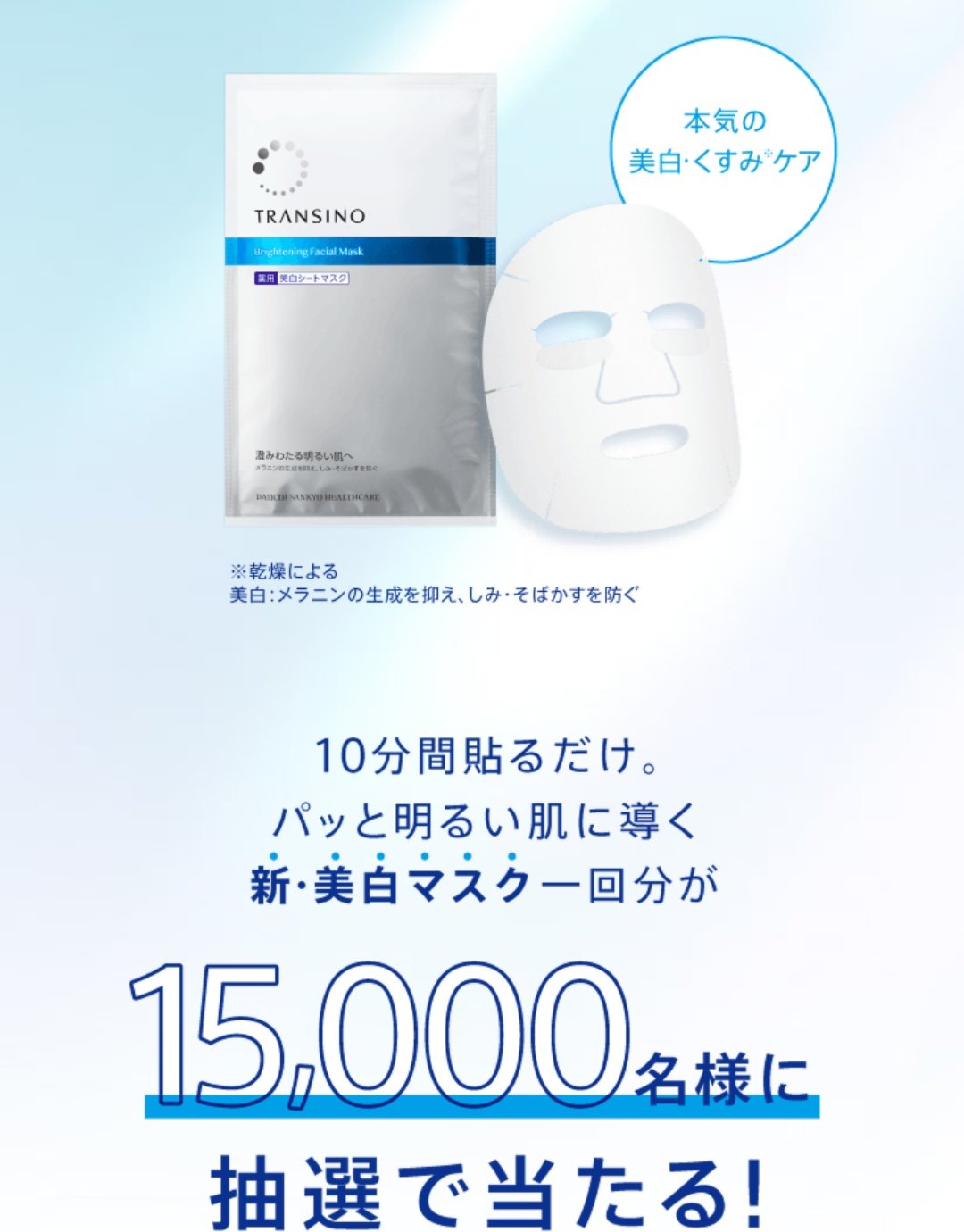 トランシーノ美白シートマスクが15000名に当たる 「PR」 懸賞情報 X Facebook LINE コピー 2026.02.13 トランシーノ美白シートマスクが抽選で15000名に当たります。 応募期間 2月13日(金)~3月10日(火) 賞品発送時期 3月中旬~4月中旬 透明感に、浸る。|トランシーノ|第一三共ヘルスケアリニューアルした美白マスクで、紫外線ダメージの速攻レスキューケアに