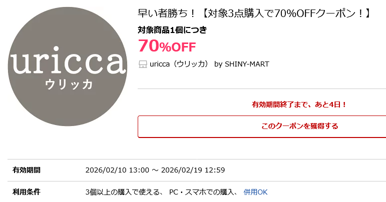 楽天uricca(ウリッカ)で3個以上の購入で使える70%OFFクーポンを配布中です