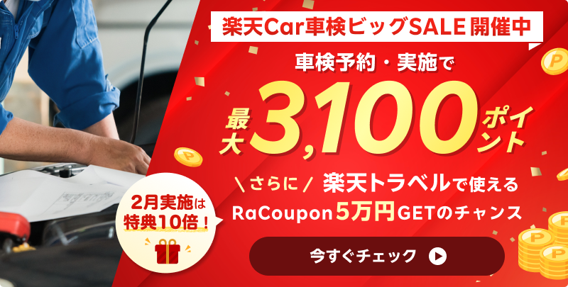 対象店限定!車検予約と実施で今なら楽天ポイント最大3100ポイント! 楽天トラベルで使えるクーポン5万円相当が抽選で当たる
