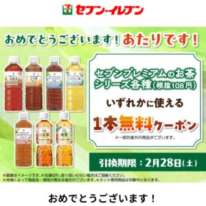 懸賞情報セブン‐イレブンのXで期間中抽選で30万名様「セブンプレミアムのお茶シリーズ各種(税抜108円)いずれかに使える1本無料クーポン」が当たります!