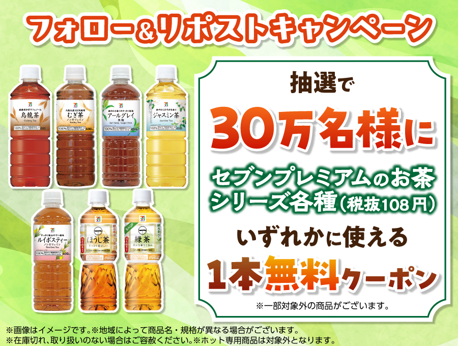 セブン‐イレブンのXで期間中抽選で30万名様「セブンプレミアムのお茶シリーズ各種(税抜108円)いずれかに使える1本無料クーポン」が当たります!