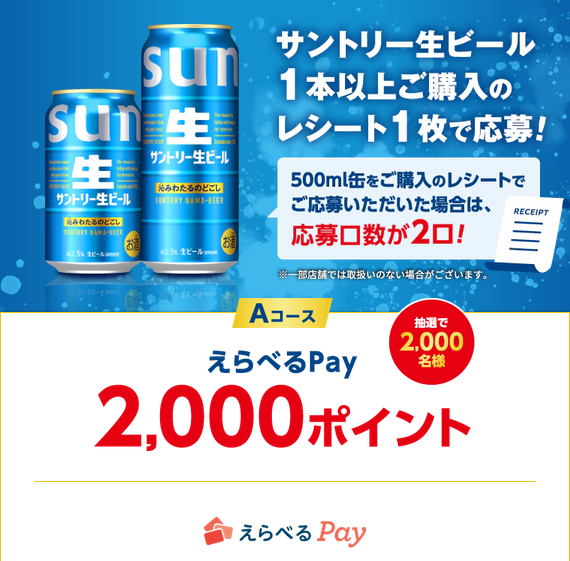 サントリー生ビール1本以上ご購入のレシート1枚で応募!えらべるPayやJCBギフトカードまたは各チェーン商品券が当たる!応募締切:2026年3月16日(月)23:59まで