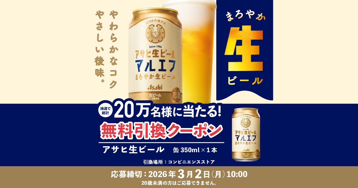 『アサヒ生ビール』が200,000名様に当たる!コンビニ無料引換えクーポンプレゼントキャンペーン|アサヒビール