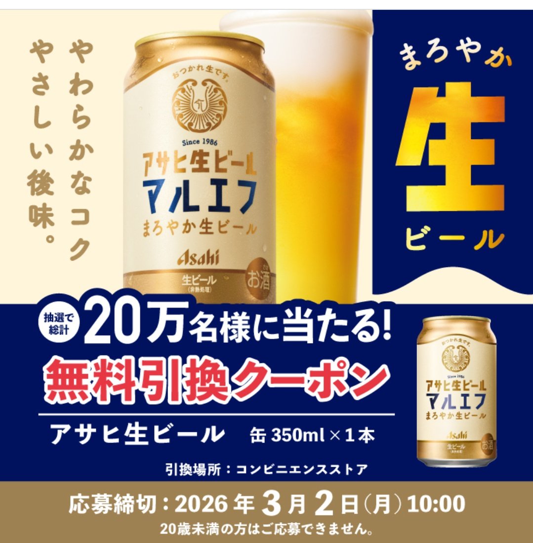 コンビニで『アサヒ生ビール』と無料引換えできるクーポンを200,000名様にプレゼントします!
