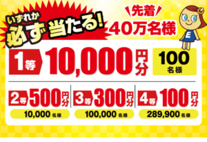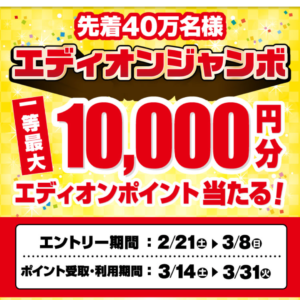 エディオンジャンボ先着40万人にエディオンポイントが当たる 「PR」 全員プレゼント X Facebook LINE コピー 2026.02.21 先着40万人に必ず当たるエディオンジャンボ エントリーが始まりました。 エントリーで最大10,000ポイント 最低でも100ポイント 1等 10000円分 100名 2等 500円分 1万名 3等 300円分 10万名 4等 100円分 289900名 はずれなし、少なくとも100ポイントは当たります。 エントリー期間 2月21日(土)~3月8日(日) ポイント受取期間 3月14日(土)~3月31日(火) 参加はエディオンアプリから!