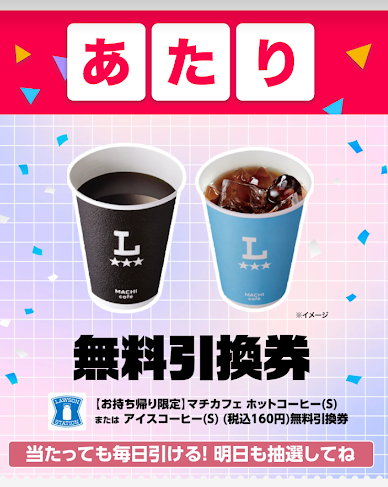 ローソンのマチカフェコーヒーSサイズがその場で当たります。