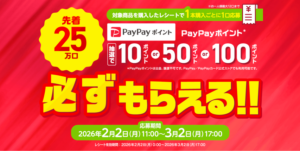 先着25万名にPayPayポイント(10円、50円、100円)いずれか必ず当たります。