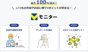 身近なお店や通販でお買い物をしてレシート投稿、アンケートを回答すると謝礼としてVポイントがもらえます。飲食店もあります。最大100%還元の案件も!