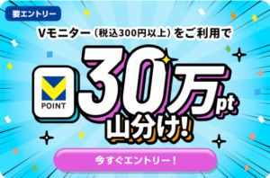 キャンペーンにエントリーし、Vモニターで1回で税込300円以上を利用し、謝礼のVポイント獲得完了で、全員に合計30万ポイントを山分けプレゼント!