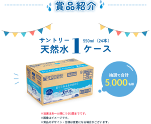 サントリー天然水 1ケース(550ml×24本)購入でもう1ケースが抽選で5,000名に当たります。