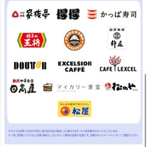 対象店舗:「家族亭」「得得」「とくとく」「かっぱ寿司」「餃子の王将」「サンマルクカフェ」「自家製麺 杵屋」「ドトールコーヒーショップ」「エクセルシオール カフェ」「カフェ レクセル」「熱烈中華食堂 日高屋」「マイカリー食堂」「松のや」「松屋」