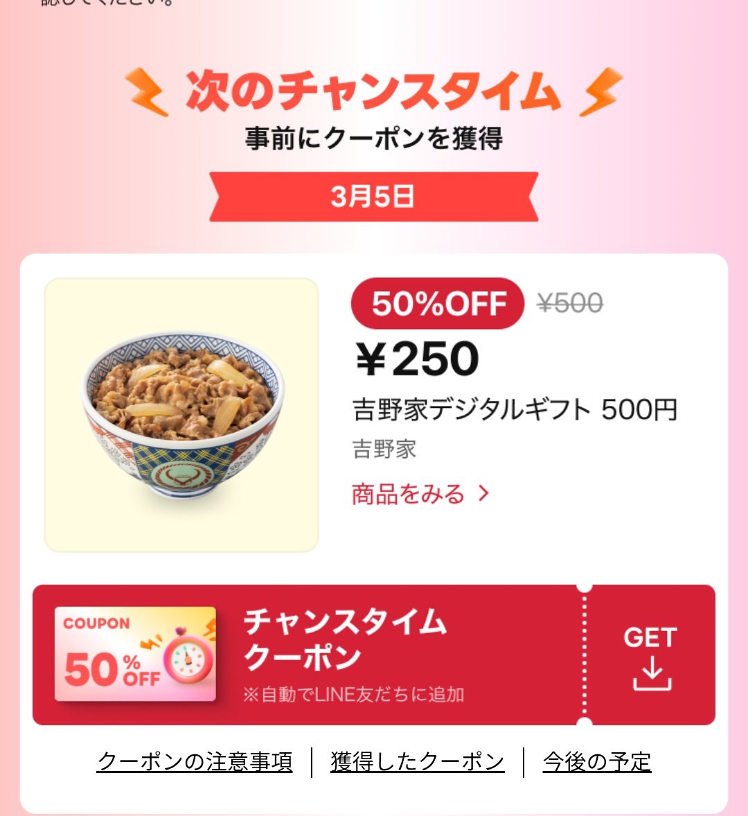 吉野家デジタルギフト500円 が50%OFFクーポンが配信されます。