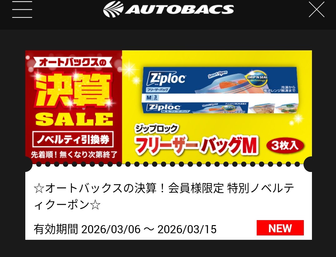 オートバックスアプリに来店でフリーザーバッグもらえるクーポンきていました。