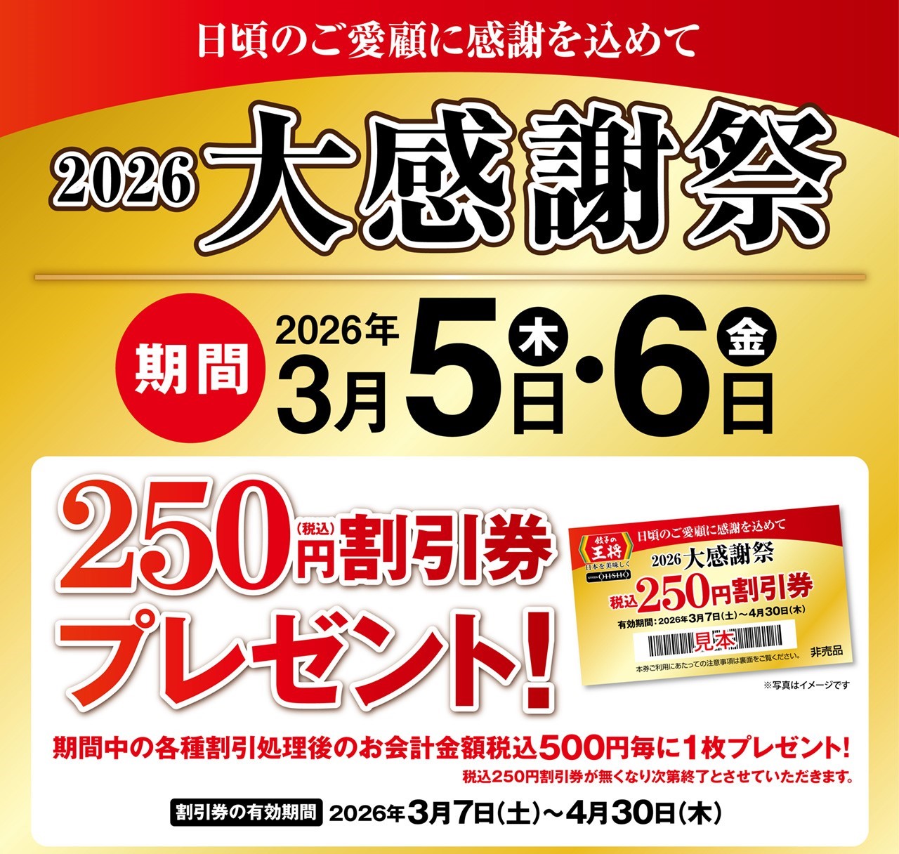 3月5日・6日 2026大感謝祭 開催のお知らせ | お知らせ | 餃子の王将