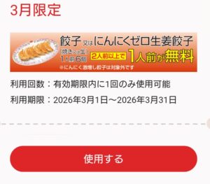 餃子の王将アプリに餃子2人前以上で1人前が無料になるクーポンもあります。