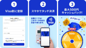 スマホで1000円以上VISAタッチ決済すると100円・150円・500円いずれか必ずキャッシュバックされるVisa割にも参加できます。
