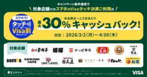 対象店舗で三井住友カードのVISAタッチ割で30%キャッシュバック