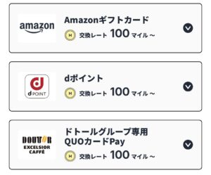 たまったマイルはAmazonギフト券やdポイントなどに交換できます。