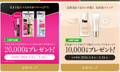 KISS ME (キスミー)サンプルプレゼント!マスカラ&マスカラリムーバー2万名・美容液ファンデ&UV下地1万名 「PR」 サンプル情報 X Facebook LINE コピー 2026.03.06 KISS ME (キスミー)公式LINEから ミニサンプル2種が抽選で当たります。 ・マスカラ&マスカラリムーバーセット 2万人 ・美容液ファンデ&UV下地セット 1万人 応募期間 2026年3月4日~2026年3月24日 KISS ME 公式LINE