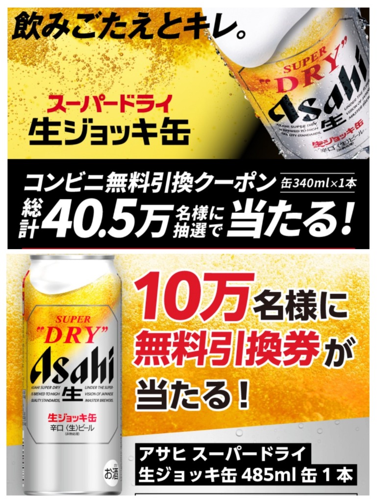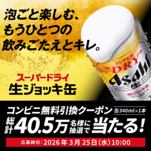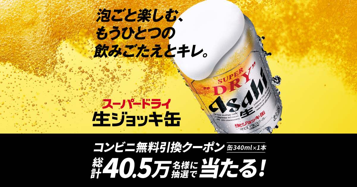 コンビニで『アサヒスーパードライ 生ジョッキ缶』と無料引換えできるクーポンを405,000名様にプレゼントします!