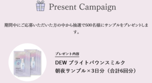 花王 DEWブライトバウンスミルクの朝夜サンプル×3日分(合計6回分)が抽選で500名に当たります。