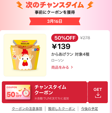 画面下の「チャンスタイム」からクーポンを取得。