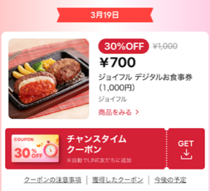3/19(水) 「ジョイフル」お食事券1000円分→700円(30%OFF)