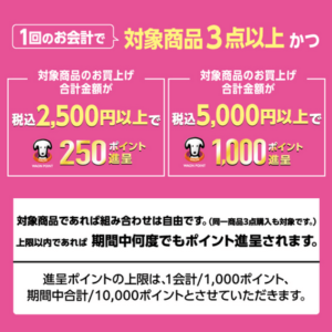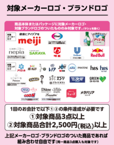 1回の会計で対象商品3点以上かつ合計金額でWAONPOINTが進呈されます。