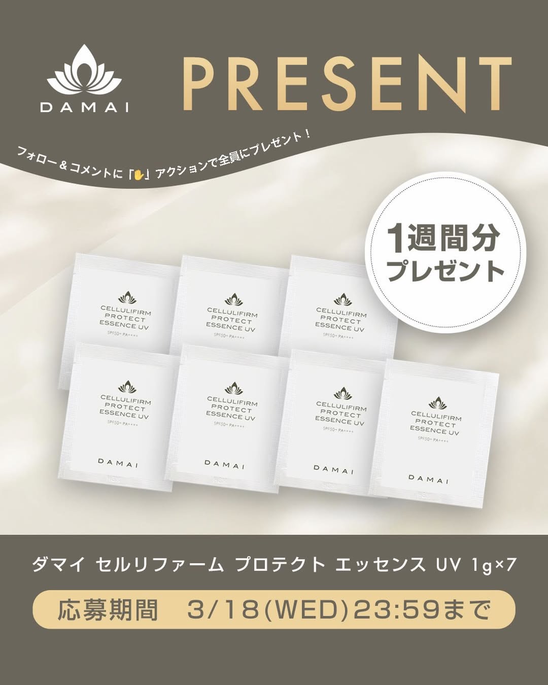 40 likes, 83 comments - damai__official on March 9, 2026: "応募者全員に当たる!エッセンスUV 1週間分プレゼント今から使いたい必須アイテム『ダマイ セルリファーム プロテクト エッ...