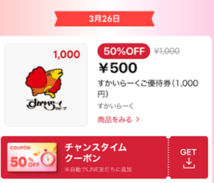 3/26(木) 「すかいらーく」お食事券1000円分→500円(50%OFF)