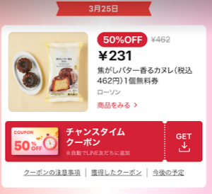 3/25(水) ローソン焦がしバター香るカヌレ 462円→231円(50%OFF)