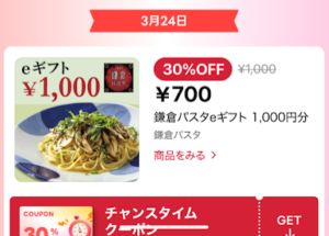 3/24(火) 鎌倉パスタeギフト 1000円分→700円 (30%OFF)