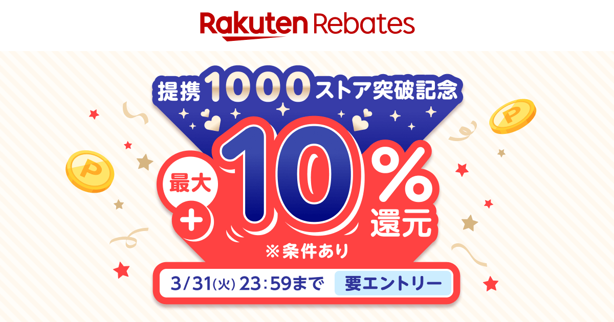 楽天リーベイツ 提携1000ストア突破記念キャンペーン 購入ストア数で最大+10%ポイント還元(上限 2000 ポイント)