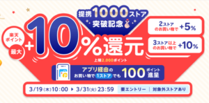楽天リーベイツ 提携1000ストア突破記念キャンペーン 購入ストア数で最大+10%ポイント還元(上限 2000 ポイント)