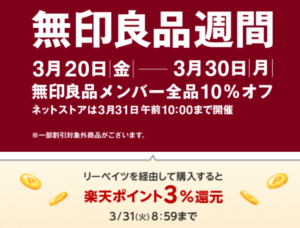 無印良品メンバーは全品10%OFFになります。(3/20〜3/30まで)
