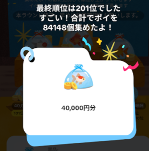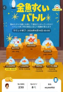 3.金魚をあつめる。集めた数に応じてランキングが上がり、賞品を獲得。