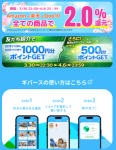 ギバース経由でAmazonで買物するだけで、自分と寄付先に2%ずつ付与されます。