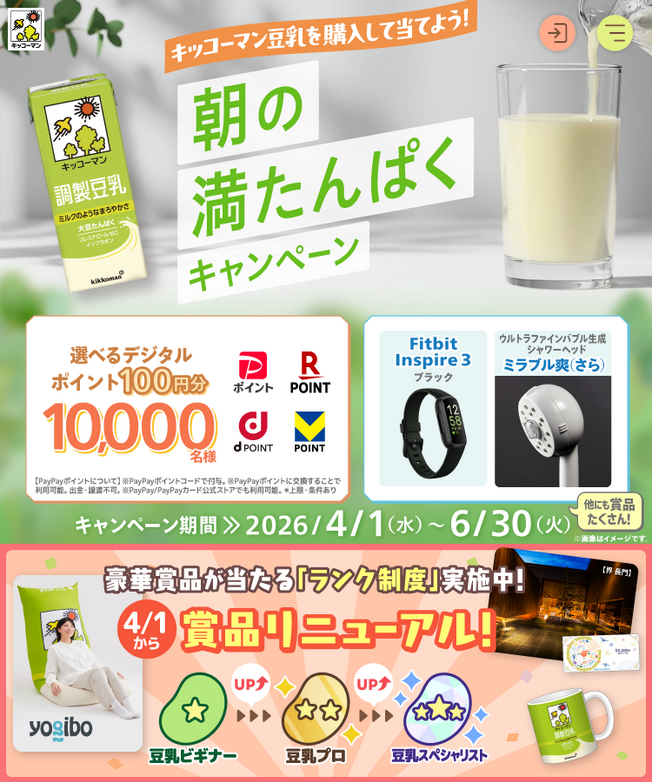 キッコーマン豆乳レシート応募で 1万人にデジタルポイント100円分などが当たります。
