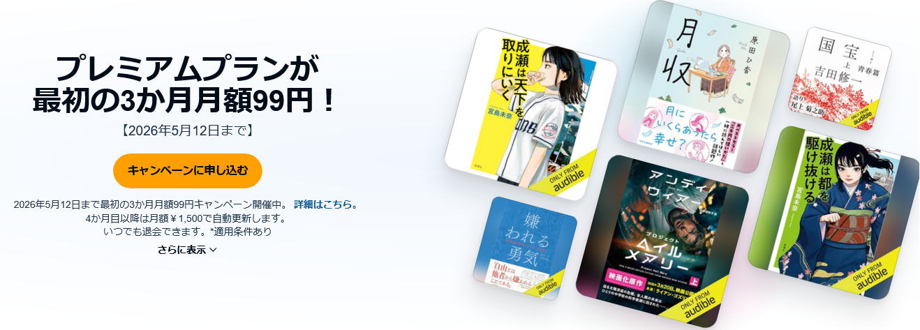 Audibleプレミアムプラン 3か月月額99円キャンペーンはこちら