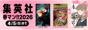 【Amazon】集英社の電子マンガ50%還元(~4/5) 「PR」 Amazon X Facebook LINE コピー 2026.04.05 Amazonで集英社の電子マンガ50%還元(~4/5) 大人気シリーズが実質半額で読めます さらにエントリー後、 購入した最初の10冊は10%還元 エントリーはこちら ・ゴールデンカムイ ・呪術廻戦 ・怪獣8号 ・氷の城壁 ・キングダム マンガも雑誌も読み放題 Kindle unlimited 無料体験はこちら▼ https://amzn.to/4sPgRGX