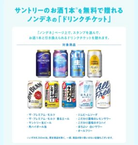 サントリーのお酒が友達に無料で送れる「ノンデネドリチケ」が 1万名に当たります。