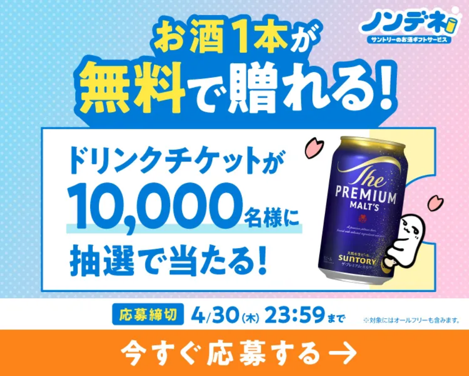 サントリーのお酒が友達に無料で送れる「ノンデネドリチケ」が 1万名に当たります。