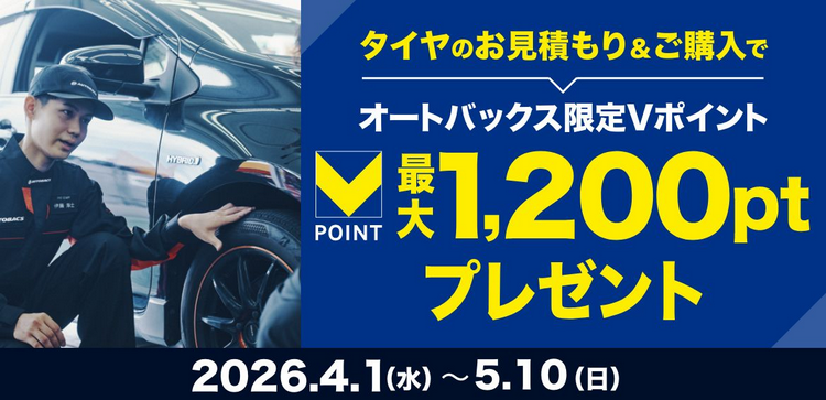 期間限定タイヤ見積もりキャンペーンのお知らせ。期間中のタイヤのお見積り&ご購入で、オートバックス限定Vポイントを最大1,200ポイントプレゼント!