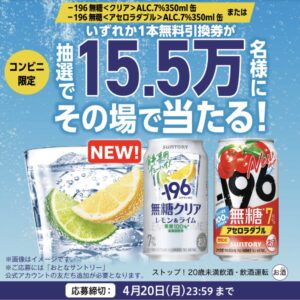 -196無糖<クリア>ALC.7%350ml缶/-196無糖<アセロラダブル>ALC.7%350ml缶が15.5万名様に当たるキャンペーン実施中!コンビニを選択して当選すると、-196無糖<クリア>ALC.7%350ml缶/-196無糖<ア...