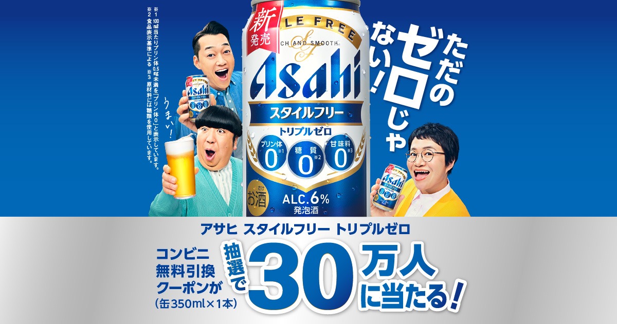 『アサヒスタイルフリートリプルゼロ』が300,000名様に当たる!コンビニ無料引換クーポンプレゼントキャンペーン|アサヒビール