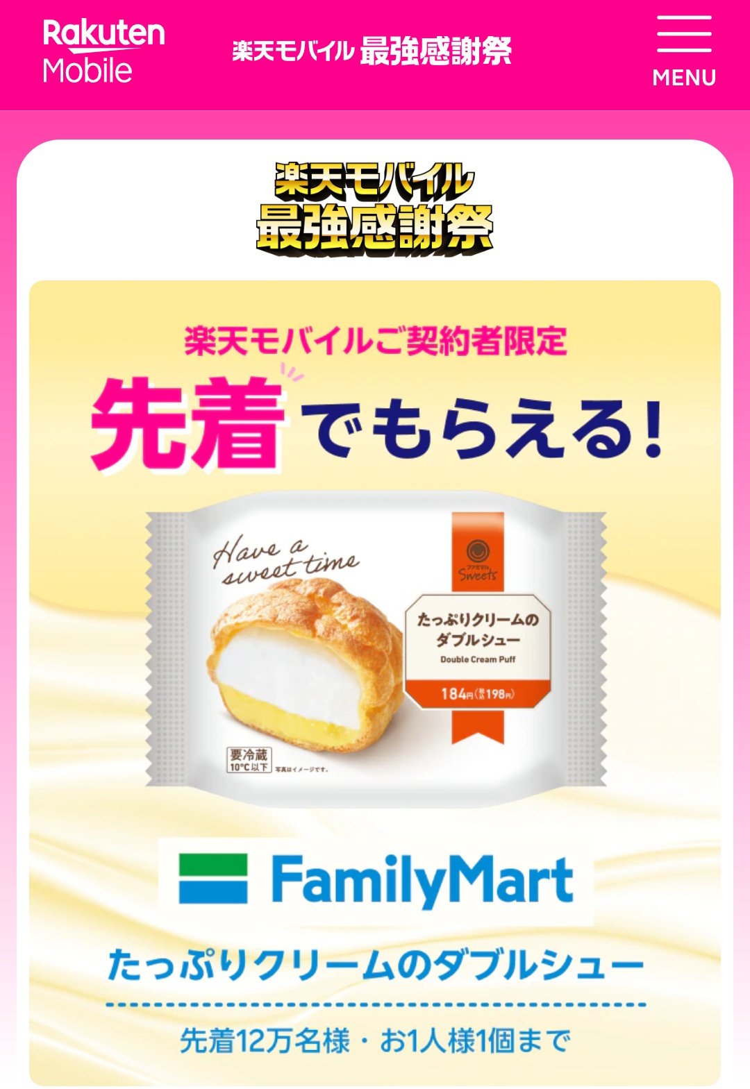 ファミリーマートの たっぷりクリームのダブルシュー が先着12万個もらえます。